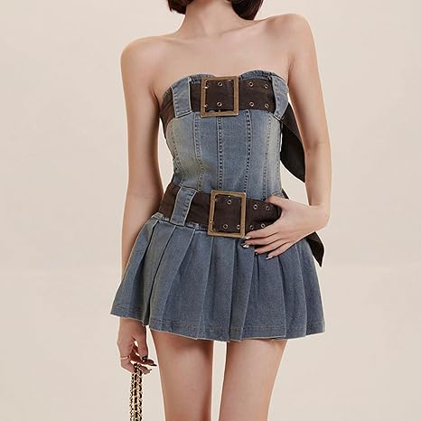 Pleated Denim Tube Top Dress Women Y2k Goth Strapless Sex Mini Dress